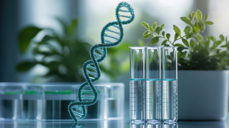 Hand holds test tube with seedling and glowing DNA helix with scissors. Clear details and vibrant...