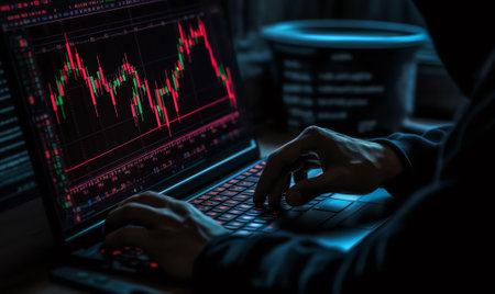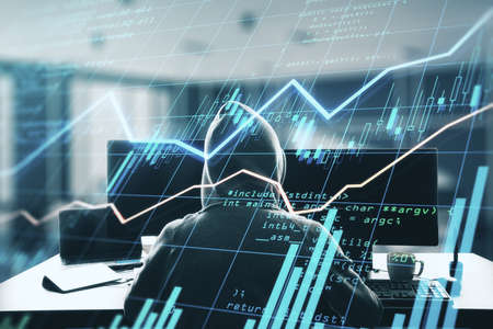 Investment security concept with hacker back with computers and digital display with financial graphs and candlestick. Double exposure