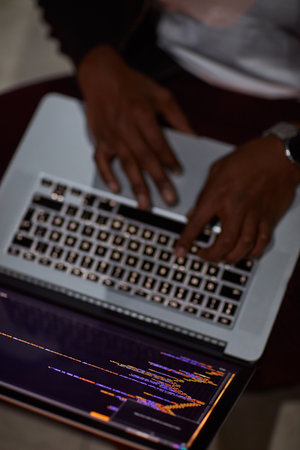 Hands of contemporary programmer pressing keys of laptop keyboard while sitting by desk and working with decoded data