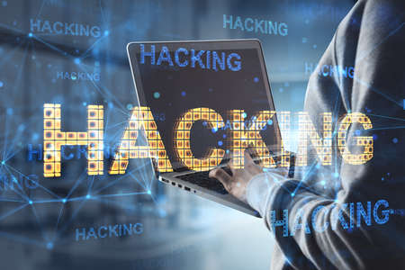 Cryptojacking concept with faceless hooded hacker working on laptop computer, with glitch effect and selective focus