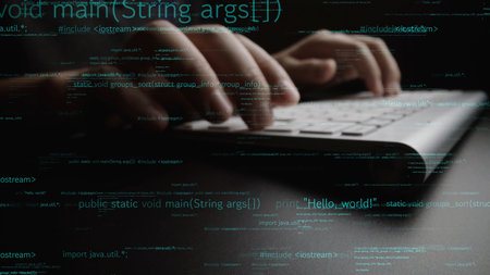 A close-up of hands typing on a laptop keyboard, immersed in a digital world with programming code surrounding them, illustrating the blend of technology and creativity.