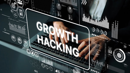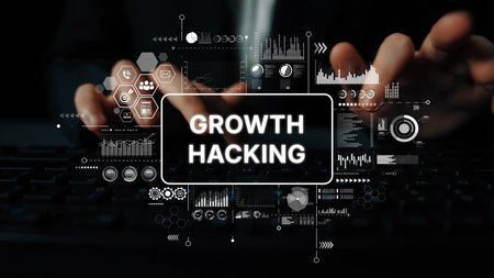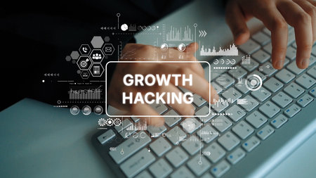 Growth Hacking Strategy with Technology and Data Analysis Concept on Keyboard. Asymptotic smart data analytic.