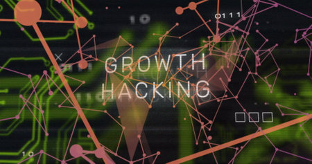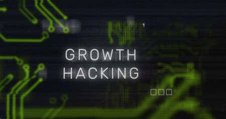 Image of growth hacking text over communication network and motherboard on black. Network, data, digital interface, marketing, business and global communication, digitally generated image.