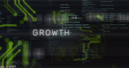 Image of growth hacking text over motherboard and processing data on black. Network, data, digital interface, marketing, business and global communication, digitally generated image.