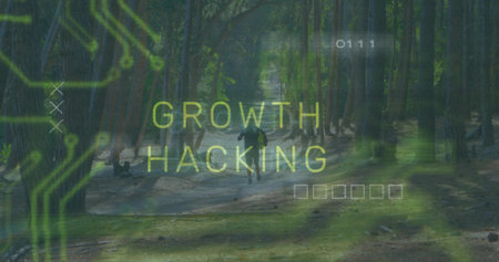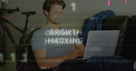Image of growth hacking text and data processing over hacker using laptop. Global technology, online security and digital interface concept digitally generated image.