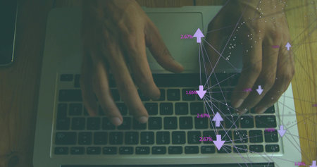 Typing adult hands pressing laptop keys on wooden desk in home office, showing digital overlay. Keyboard, keystroke, analytics, data, visualization, network, arrows