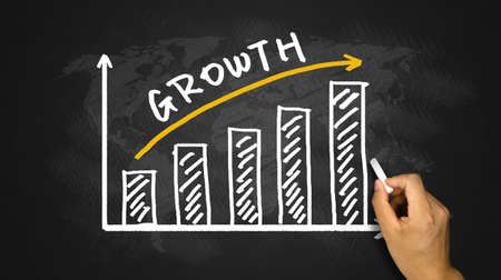 Growing plant on a miniature bar graph symbolizing business growth, with chalkboard backgrounds and colorful plants adding to the concept