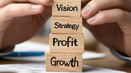Hands arranging wooden blocks with words vision, strategy, profit, growth. Building a successful business concept.