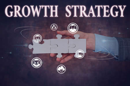 Hand writing sign Growth Strategy. Word Written on Strategy aimed at winning larger market share in shortterm Hand Holding Jigsaw Puzzle Piece Unlocking New Futuristic Technologies.