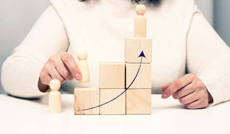 Ladder career path for business growth success process concept. Hand arranging wood block stacking as step stair with arrow up