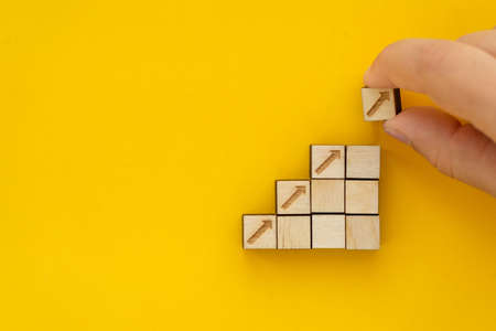 Growth and success concept. Business common goals and strategies. Hand puts wooden cubes with growth trend performance on grey background and copy space. Banner for new action plan ,goals, success.