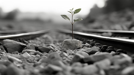 black and white image of a plant growing on railroad tracks