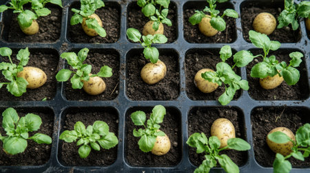 the small delicate seedlings nestled in a tray filled with black soil, against a vibrant spring background, promising growth for plants and vegetables