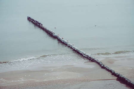 A breakwater on the seashore made of wooden supports. Seagulls sit on it in the middle of the sea. Sunny bright day.