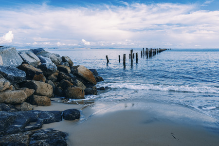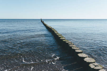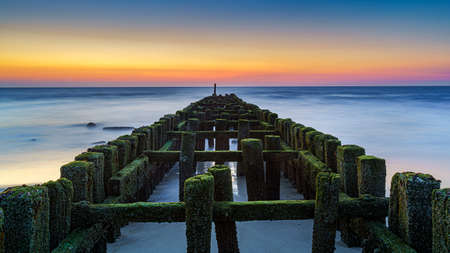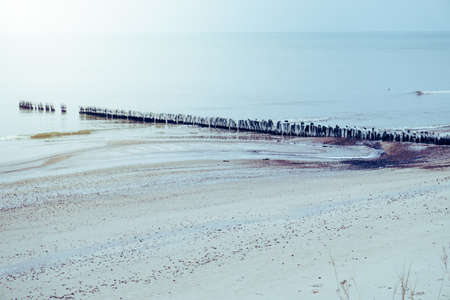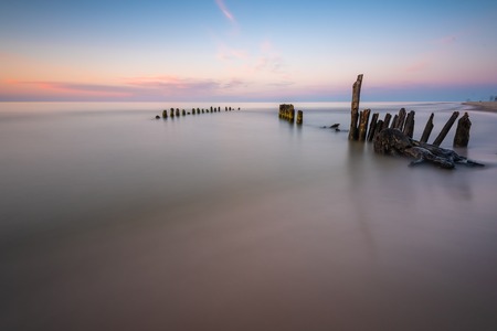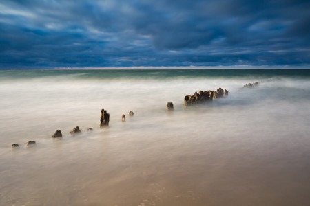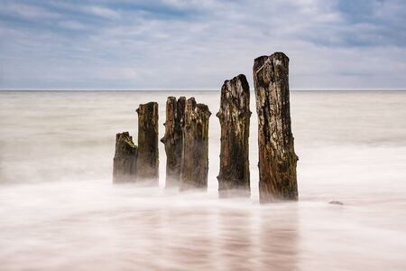 Long exposure breakwater photo. Baltic sea shore with old destroyed wooden brakwater.