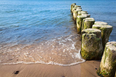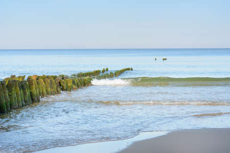 Breakwater on the beach of the Baltic Sea near Rewal in Poland