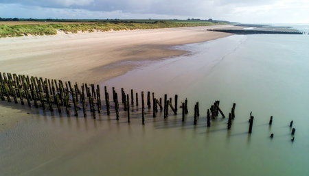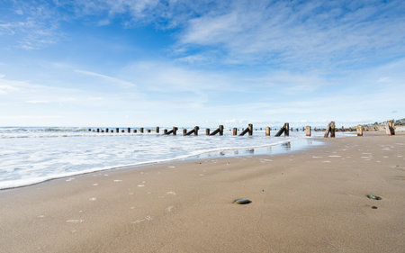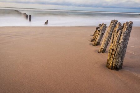Dramatic shot of a wooden breakwater found at Hornsea Beach, East Yorkshire, UK.
