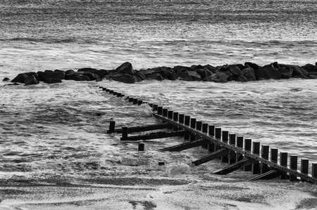 Wooden revetments at West Runton in black and white seen on the North Norfolk coast in June 2021.
