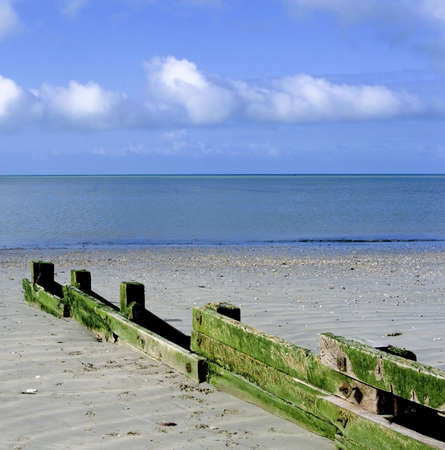 Coastal defences on an English beach. These wooden structures prevent the beach being washed away by the tides.