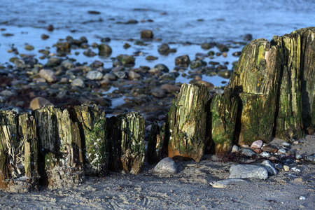 Weathered wooden groynes, green from moss and algae on the beach with sand and stones on the Baltic Sea in northern Germany, tourist resort landscape, copy space, selected focus, narrow depth of field