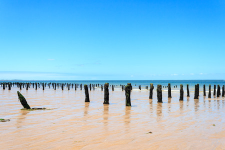 Wooden piles overgrown with algae, stuck in the shoreline of the sea, protection against waves.