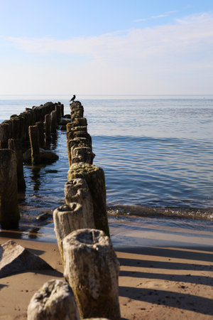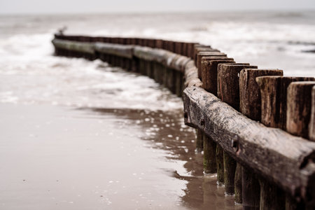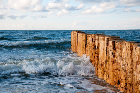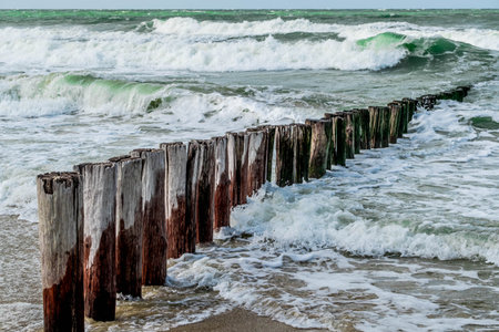 groynes on the beach of the Baltic Sea in Zingst. Waves break on the wood. they protect the coast of the German Baltic Sea from the waves. In addition, they are also beautiful to look at.