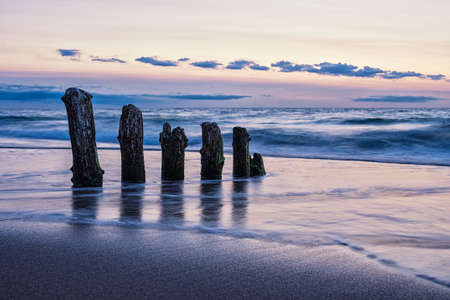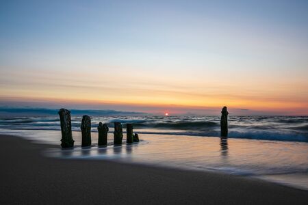 Stakes on the Baltic sea at sunset time, Karwia village, Poland