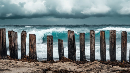 Captivating scene of a rugged coastline featuring weathered wooden posts standing against the backdrop of turbulent waves and a stormy sky.