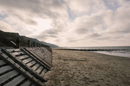 Moody beach landscape with sea defence East coast UK. Sandy beach with wooden sea defence structure protecting the cliff edge.