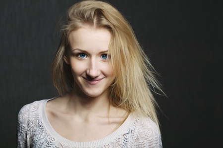 Close up portrait of smiling young woman with long blond hair