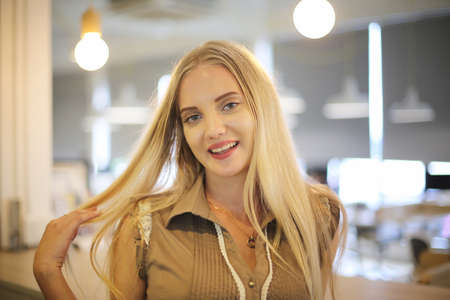 portrait of a beautiful fashion girl with blonde hair posed indoor.