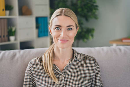 Photo of nice charming lovely lady sit comfy divan enjoy modern apartment hotel trip wear plaid outfit