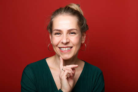 Happy joful adult fashionable woman smiling cheerfully, female being in great mood.