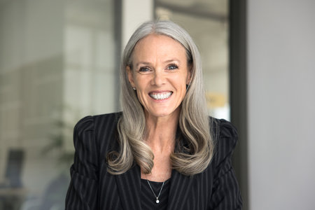 Happy grey haired senior executive lady in elegant formal cloth looking at camera, smiling for portrait. Positive mature businesswoman, company leader, CEO video call screen head shot