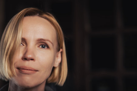 portrait of an attractive middle-aged woman with a slight smile, sadness in her eyes, looks into the camera on a dark background. Place for text.