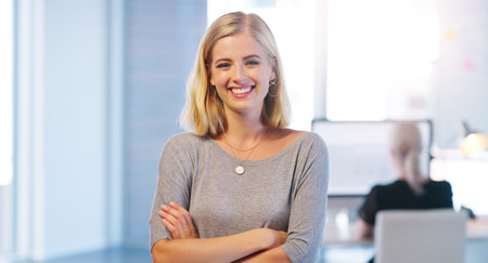 Everything is running smoothly today. Portrait of a confident young businesswoman standing with her arms folded inside of the office.