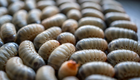 A detailed close-up showcases a collection of edible palm weevil larvae, highlighting their potential as a sustainable and nutritious food source.