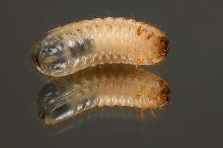 The larvae of the may beetle (Melolontha). Beetle larvae on the mirror. High resolution photo. Full depth of field.
