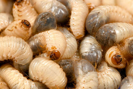 Larva. Vile disgusting maggot. Image of grub worms. Beetle larvae. Nasty insect. Pest root. Sickening animal.