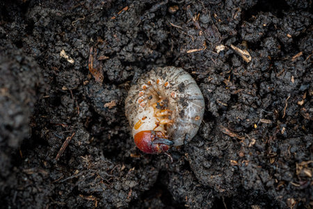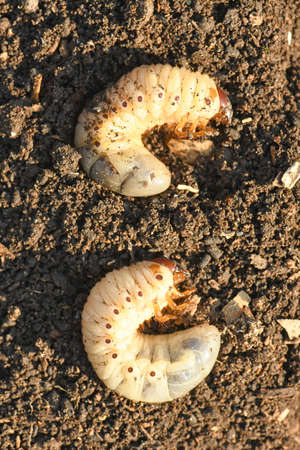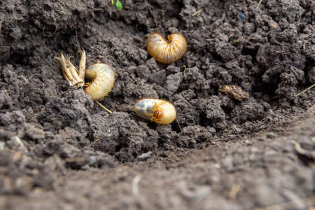cockchafer grubs (Melolontha melolontha) on garden soil closeup