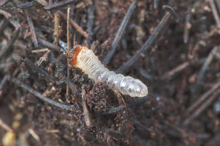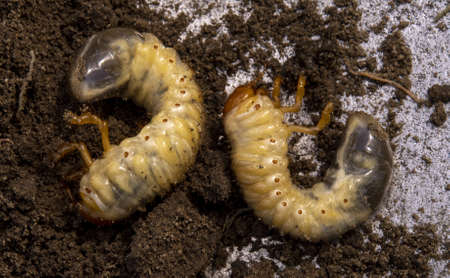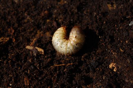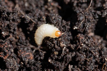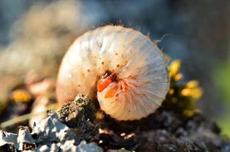 Thick white beetle larvae on the ground in springtime