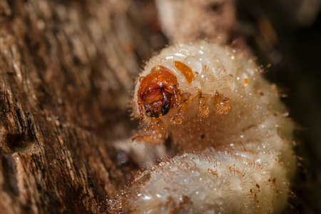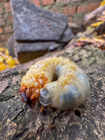 Garden larva insect pest. Cockchafer beetle larvae straightened up on wooden surface.
