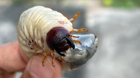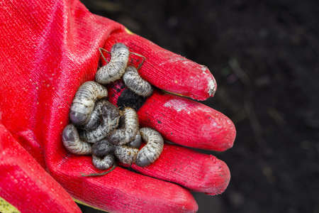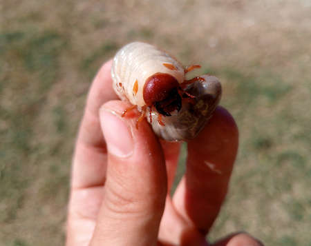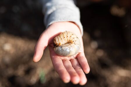 cockchaferlarva pest eating the roots of trees in the garden, cockchafer on the hand