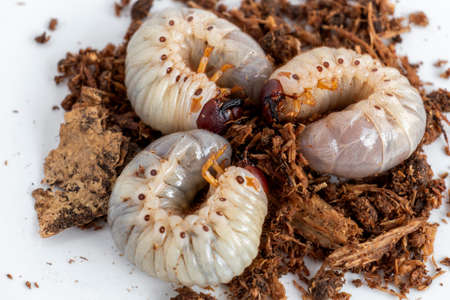 Grub Worms or Rhinoceros Beetle grow in soil on farm which agriculture gardening. Worm insects for eating as food, it is good source of protein edible. Environment and Entomophagy concept.