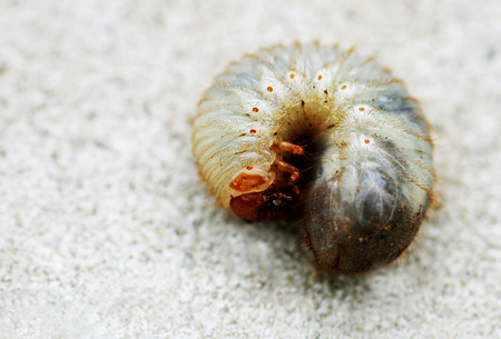 Maybug larva on concrete surface, closeup, selective focus.