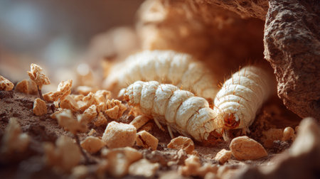 Close-up of pale beetle grubs in an earthy burrow.