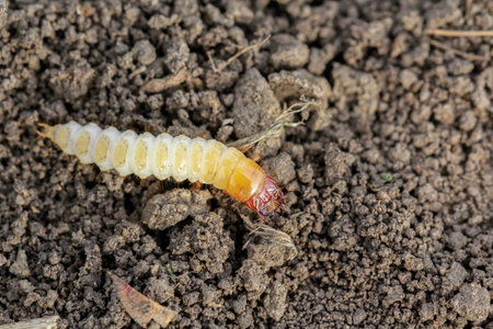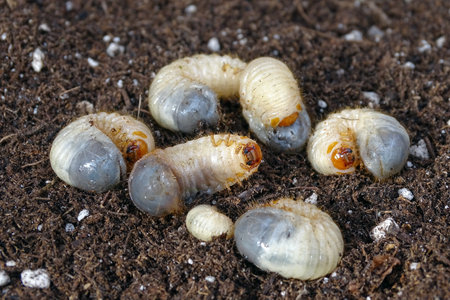 Beetle larvae (grub) are soft- bodied, soil-dwelling insects with a light brown head.