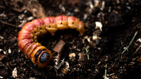 Selective focus grub worms beetle on the ground, Larvae close up.