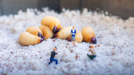 Miniature people : Workers working with insect larva