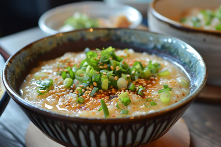 A delicious bowl of rice porridge topped with crispy ingredients and fresh green onions. This comforting dish combines warm flavors and vibrant colors for an inviting meal.